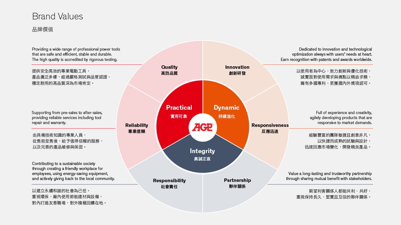 With the repositioning of the AGP brand in the global market, three new core values were decided upon within the branding project: Practical, Dynamic and Integrity.
