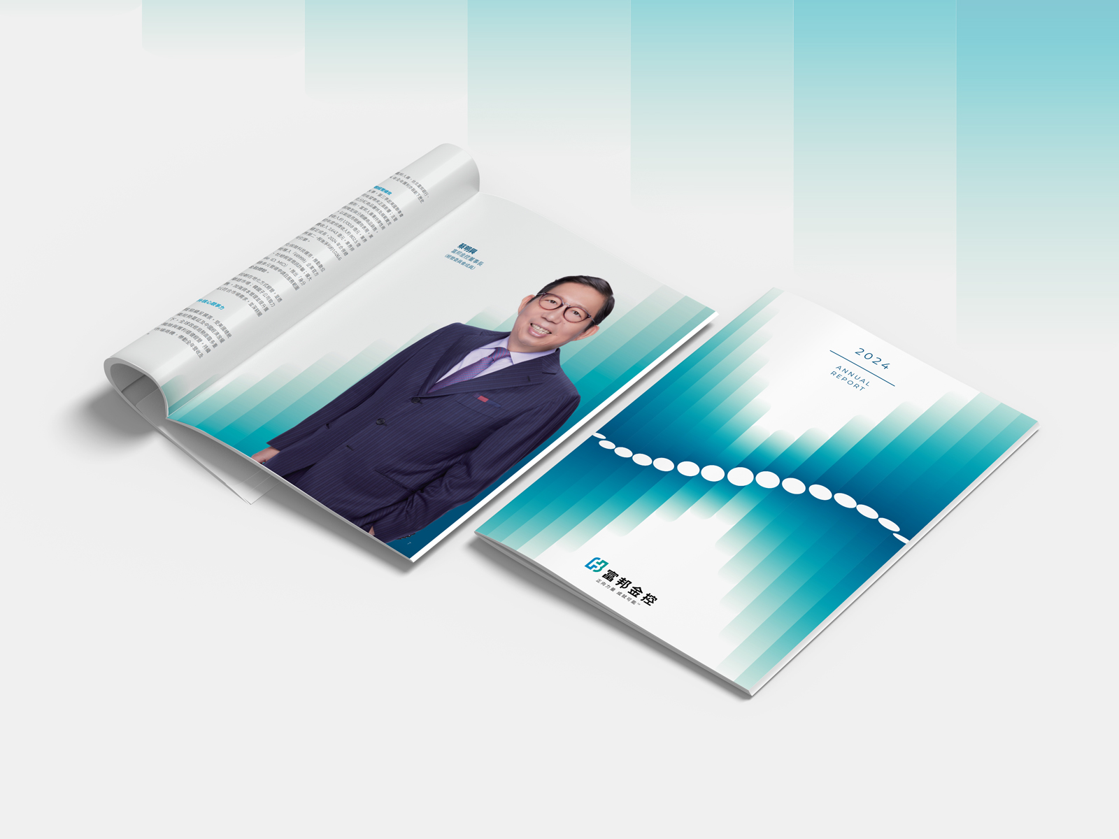 2024年度 – 富邦金控品牌形象主視覺,以躍進、共振為設計靈感,具體表現富邦金控連續16年蟬聯台灣金控業之冠,創造亮眼的績效表現。主視覺採用連續圓點元素,貫穿主畫面,並輔以波浪推疊前進的動線,結合圓點翻轉效果與逐步升高交錯的筆直線條,呈現躍進與共振的動態視覺變化。此設計呼應富邦金控秉持一甲子的正向信念,始終竭盡心力為同仁、客戶、股東、社會大眾等利害關係人創造永續共好,以及在挑戰與機會並存的2024年,創造金控盈餘新高,戮力推動Run For GreenTM策略,實踐以金融力量推動產業綠色轉型、環境議題主流化的正面影響。