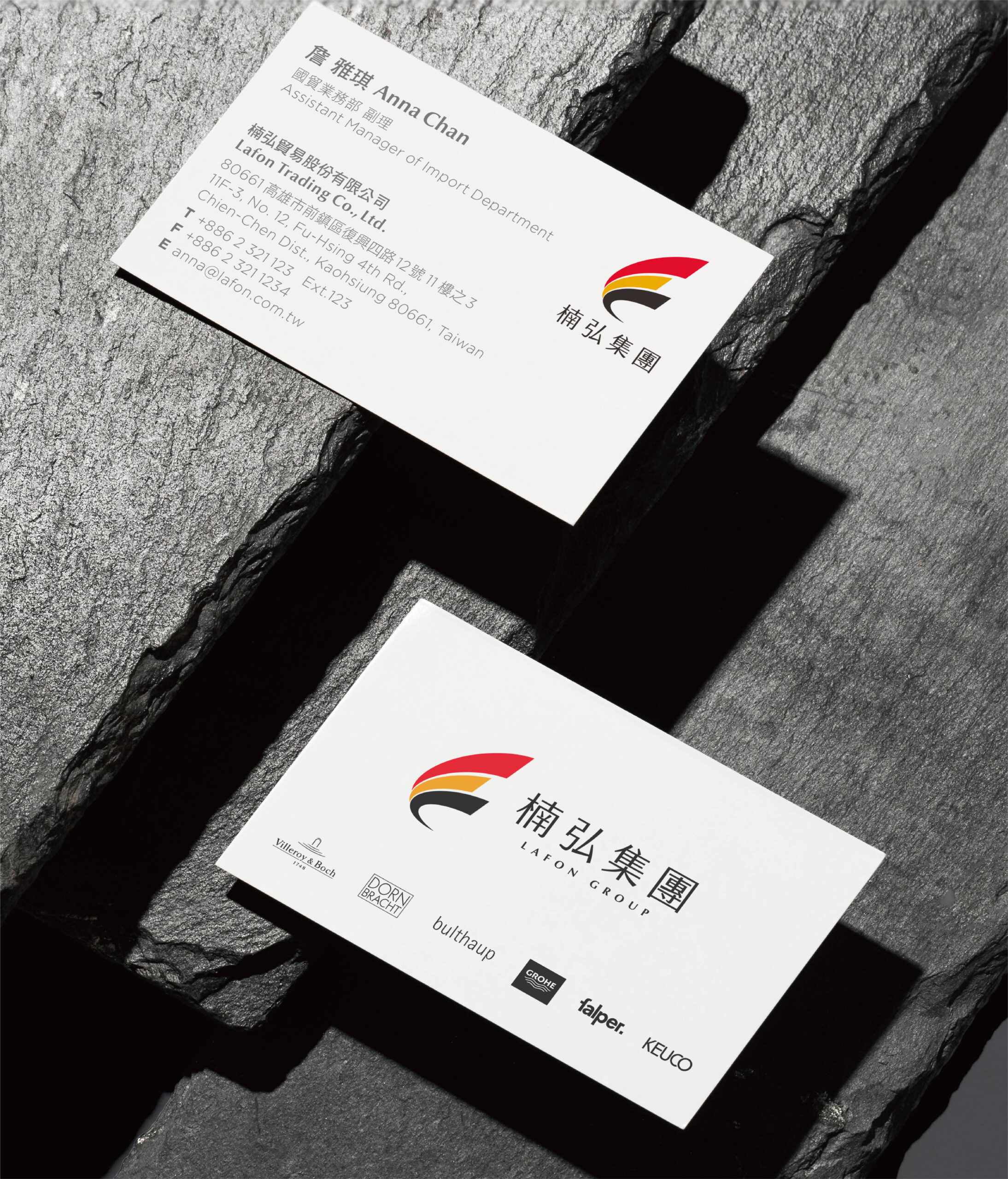 全新識別導入集團化的系統規範,重新定義標誌識別與中英文字體識別的視覺比重:標誌比例放大為主視覺,以強化並統一楠弘集團形象;中文字體識別保留「楠弘」二字在前,門市名稱二字在後,輔助標語位置則使用楠弘集團英文全名「LAFON GROUP」。英文字體識別統一為大寫「LAFON」,而「A」字體設計概念源自楠弘集團標誌的拋物曲線元素,進一步鞏固楠弘在國際市場的頂級地位。