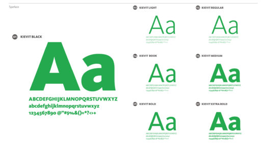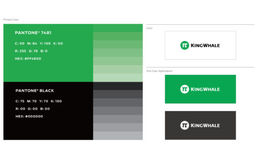 Kingwhale 標誌識別色彩亦承襲傳統,運用鮮明的綠色品牌色,將視線聚焦到反白空間內的 π 符碼,同時傳遞深植於品牌的永續信念與生生不息的原動力。黑色的字體識別則展現 Kingwhale 以品牌實力獲得全球客戶信賴的穩重與自信。字體識別採用無襯線的 Kievit 字體家族,給人現代簡潔,平易近人的感受。